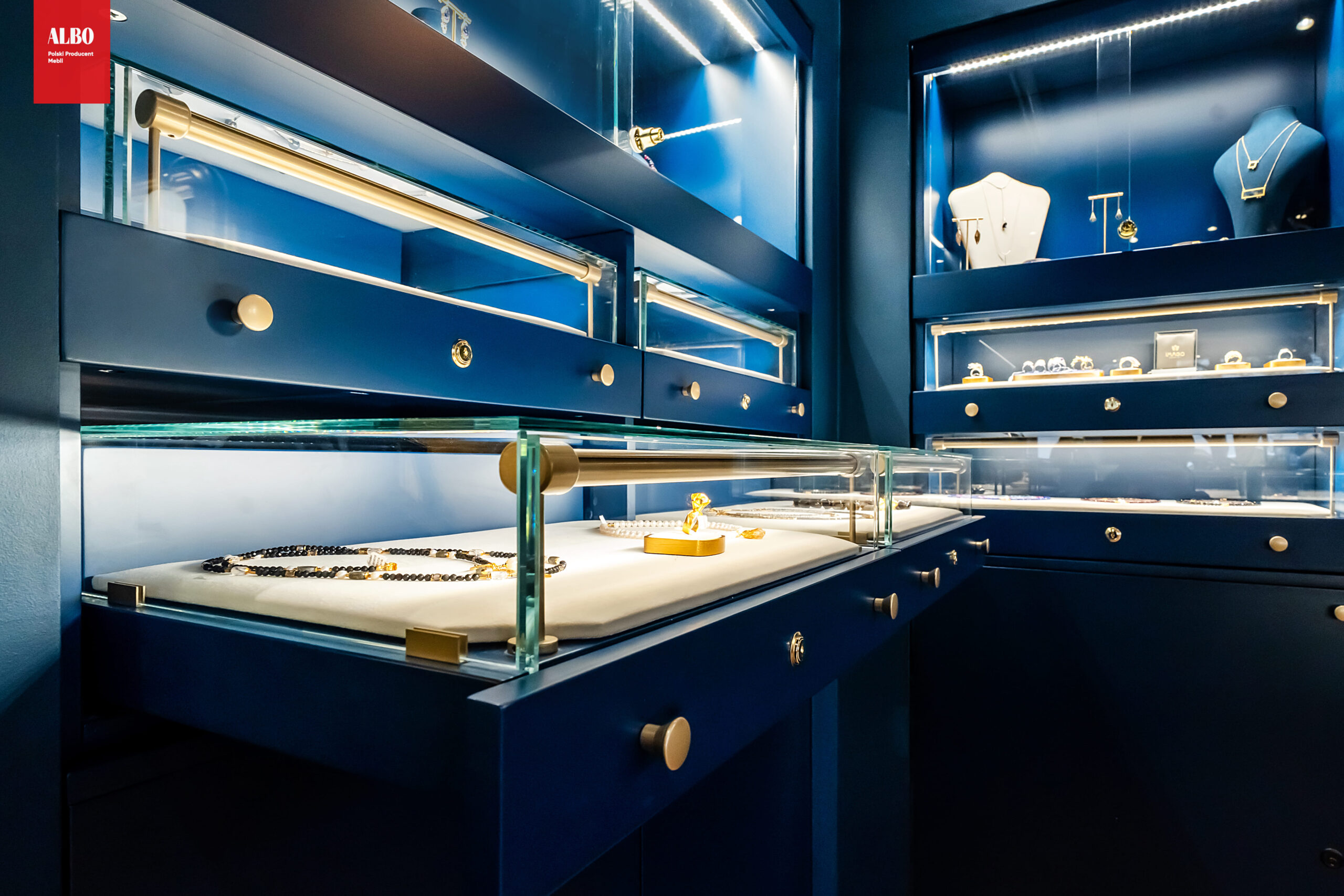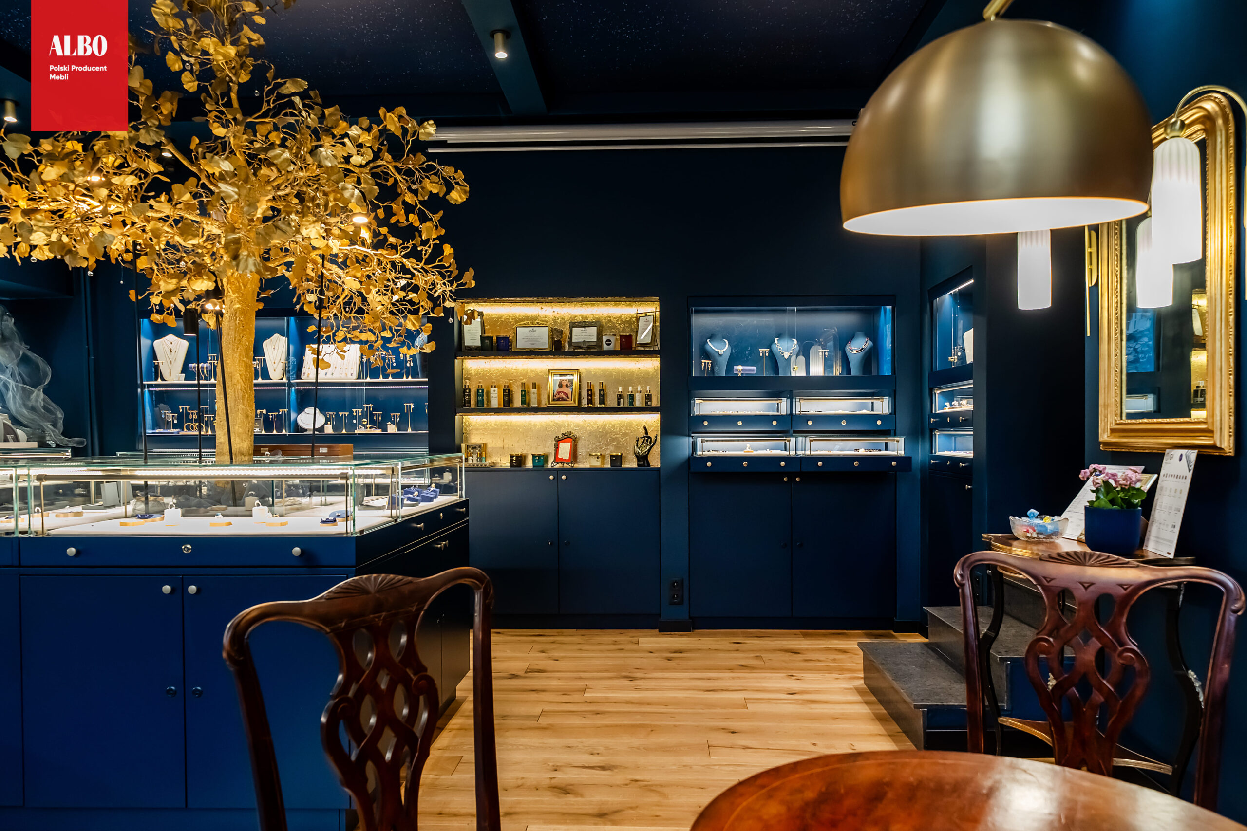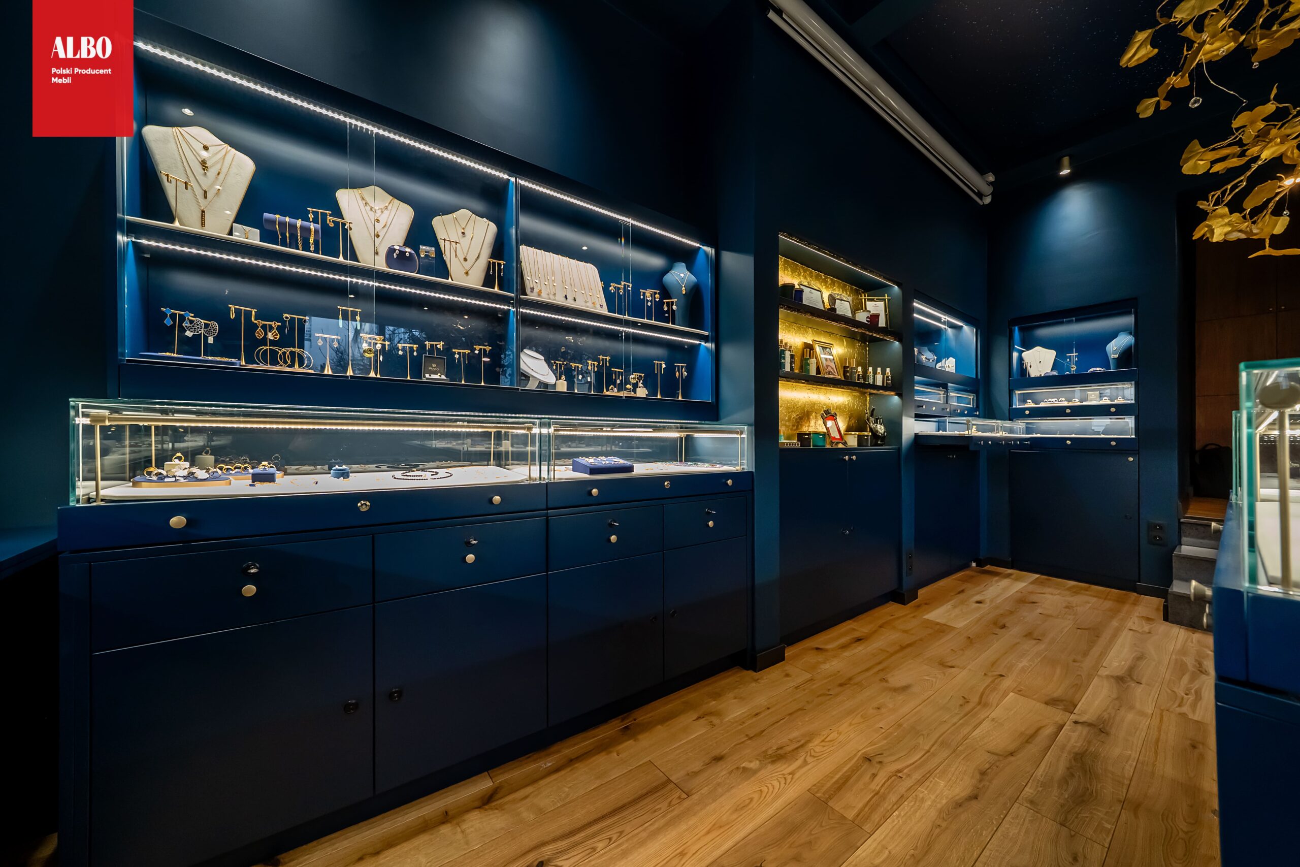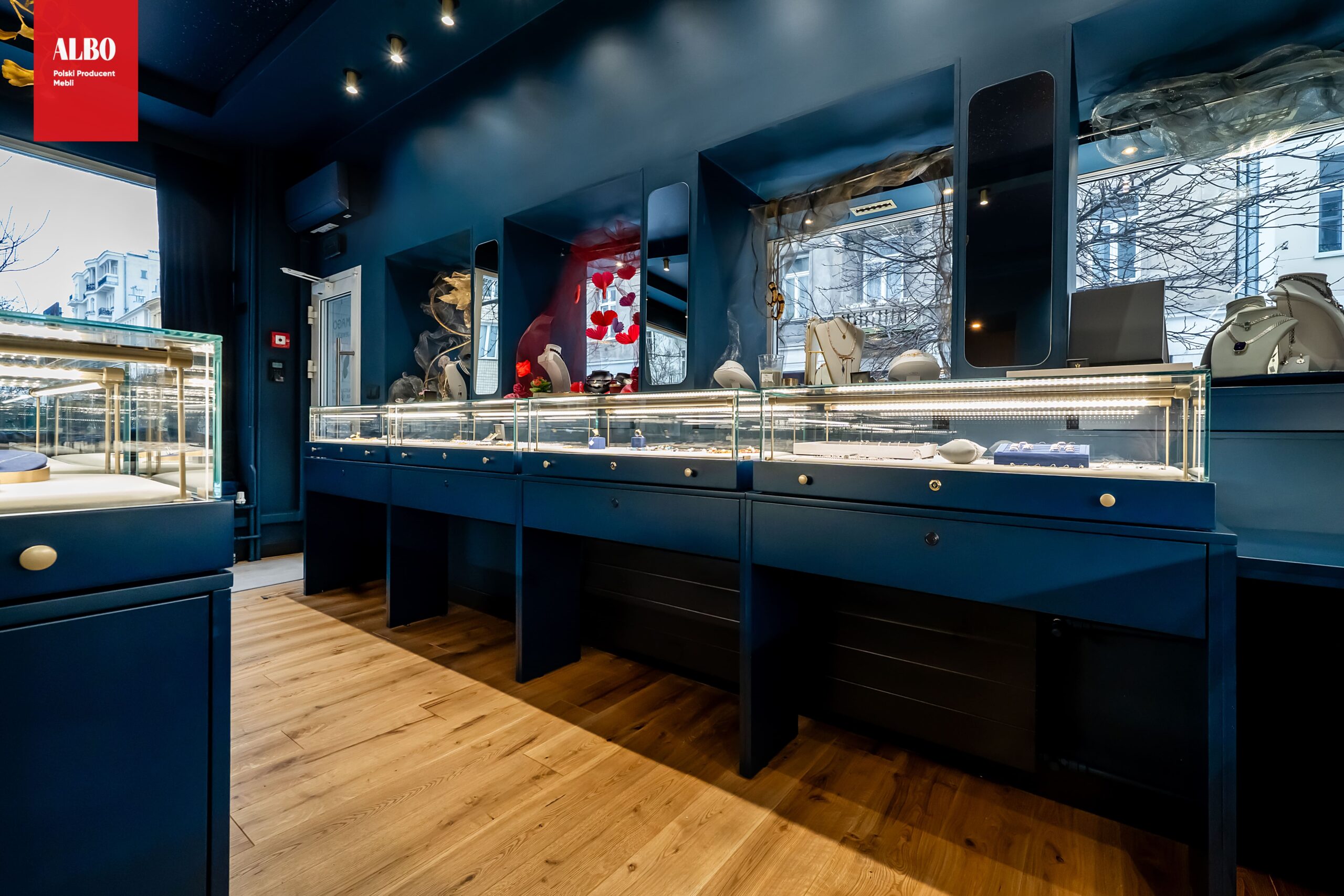 W tej realizacji wykonaliśmy witryny jubilerskie i gabloty szklane w kolorze indygo, co przyczyniło się do uzyskania wyjątkowego efektu. Szklane witryny zaprojektowaliśmy w oparciu o standardowe rozwiązania, jedocześnie dostosowaliśmy je do indywidualnych potrzeb klienta i pomieszczenia. Meble jubilerskie w monochromatycznym kolorze kobaltowym zostały zaprojektowane tak, aby nadać wnętrzu wyjątkowej klasy i nowoczesnego charakteru. W galerii jubilerskiej zostały wykorzystane witryny szklane z szufladami, które umożliwiają bezpieczną prezentację biżuterii klientom. Centralnym punktem została wyspa sklepowa z profesjonalnym oświetleniem LED, w której znajduje się przestrzeń magazynowa umożliwiająca przechowywanie opakowań prezentowych i zapasów. Witryny szklane i wyspa zostały oświetlone profesjonalnym oświetleniem HASTER, które zostało dobrane do potrzeb i oczekiwań klientów, dzięki czemu blask naturalnych kamieni jest idealnie podkreślony.
