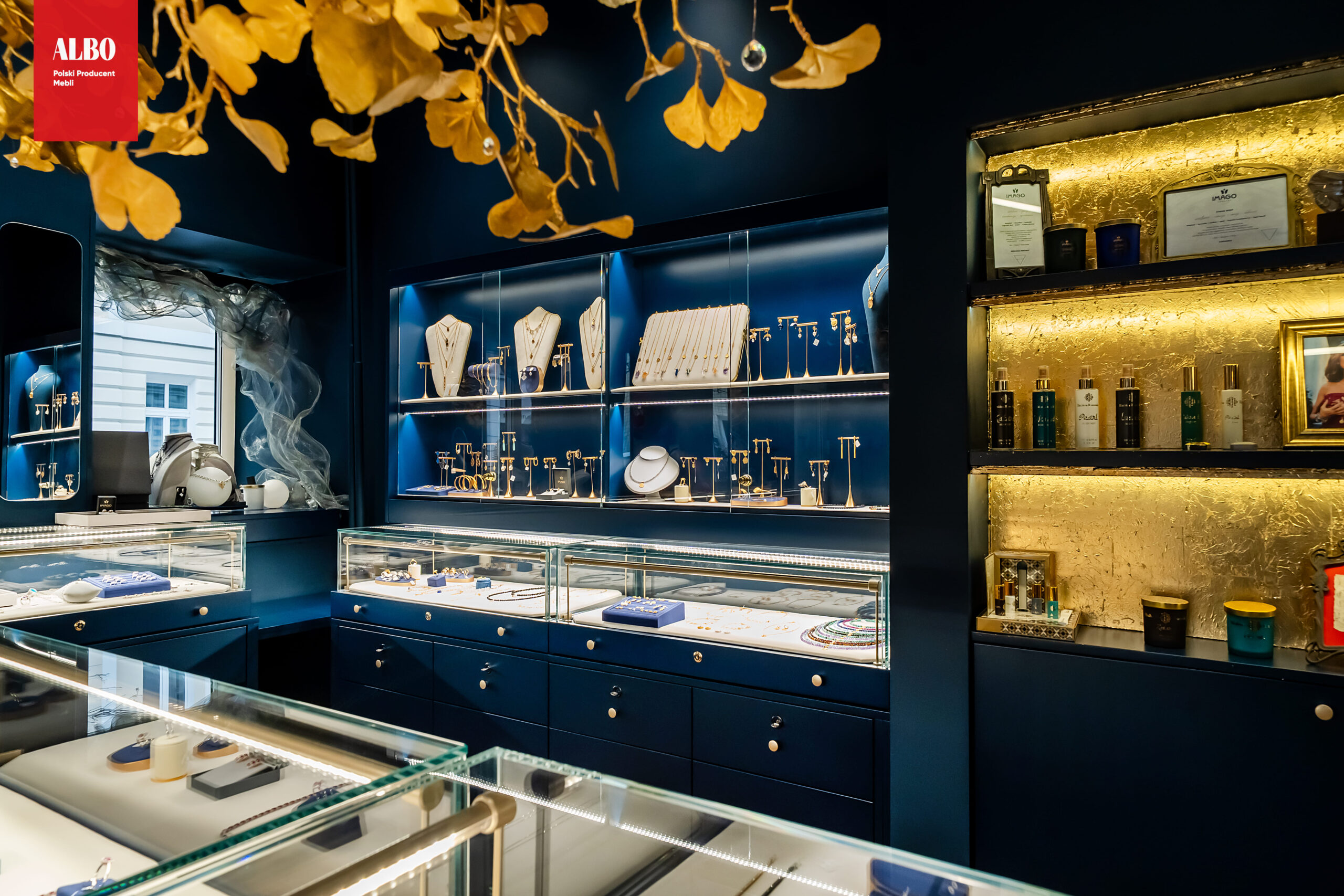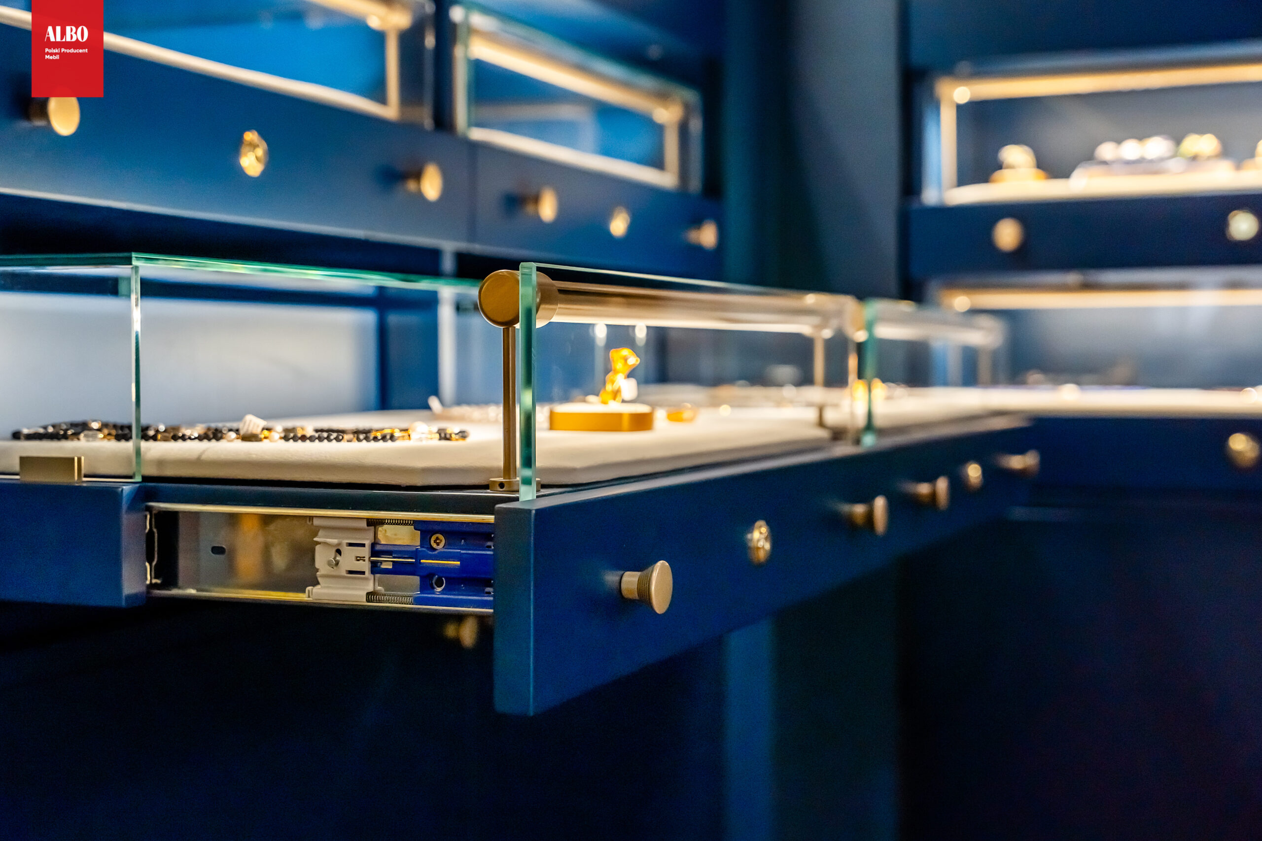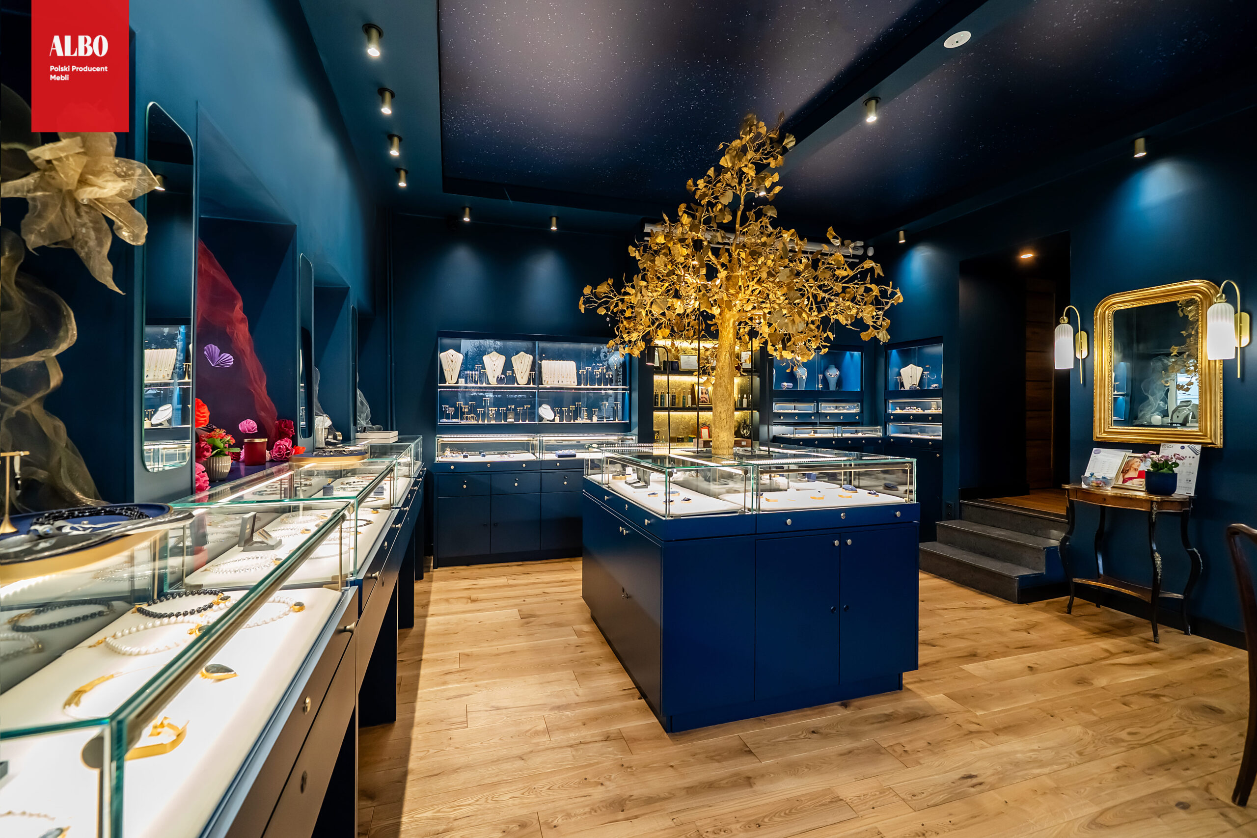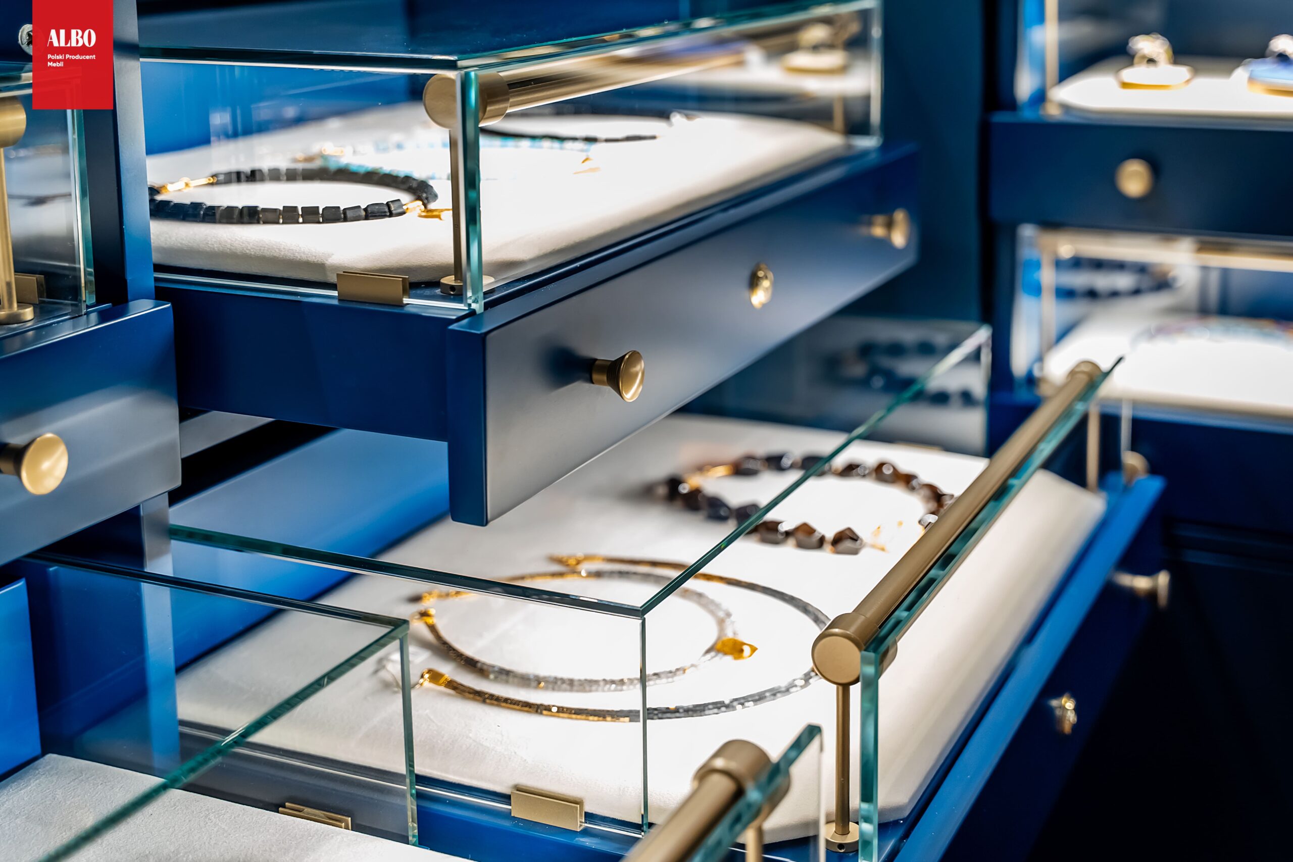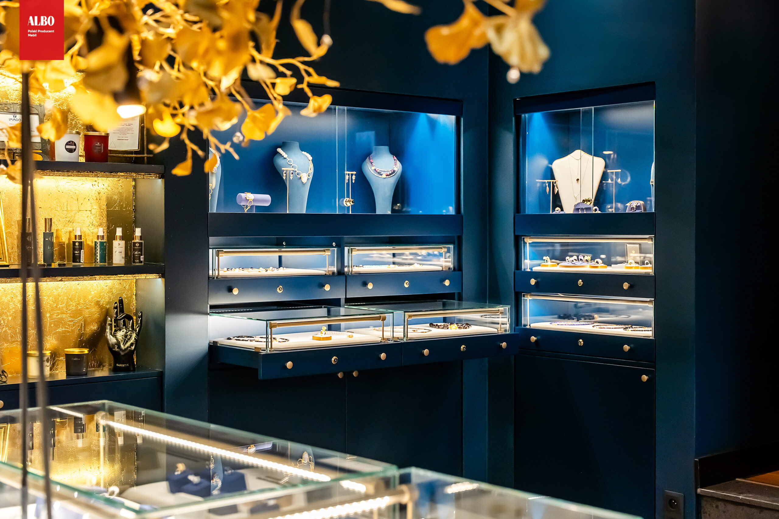 W tej realizacji wykonaliśmy witryny jubilerskie i gabloty szklane w kolorze indygo, co przyczyniło się do uzyskania wyjątkowego efektu. Szklane witryny zaprojektowaliśmy w oparciu o standardowe rozwiązania, jedocześnie dostosowaliśmy je do indywidualnych potrzeb klienta i pomieszczenia. Meble jubilerskie w monochromatycznym kolorze kobaltowym zostały zaprojektowane tak, aby nadać wnętrzu wyjątkowej klasy i nowoczesnego charakteru. W galerii jubilerskiej zostały wykorzystane witryny szklane z szufladami, które umożliwiają bezpieczną prezentację biżuterii klientom. Centralnym punktem została wyspa sklepowa z profesjonalnym oświetleniem LED, w której znajduje się przestrzeń magazynowa umożliwiająca przechowywanie opakowań prezentowych i zapasów. Witryny szklane i wyspa zostały oświetlone profesjonalnym oświetleniem HASTER, które zostało dobrane do potrzeb i oczekiwań klientów, dzięki czemu blask naturalnych kamieni jest idealnie podkreślony.