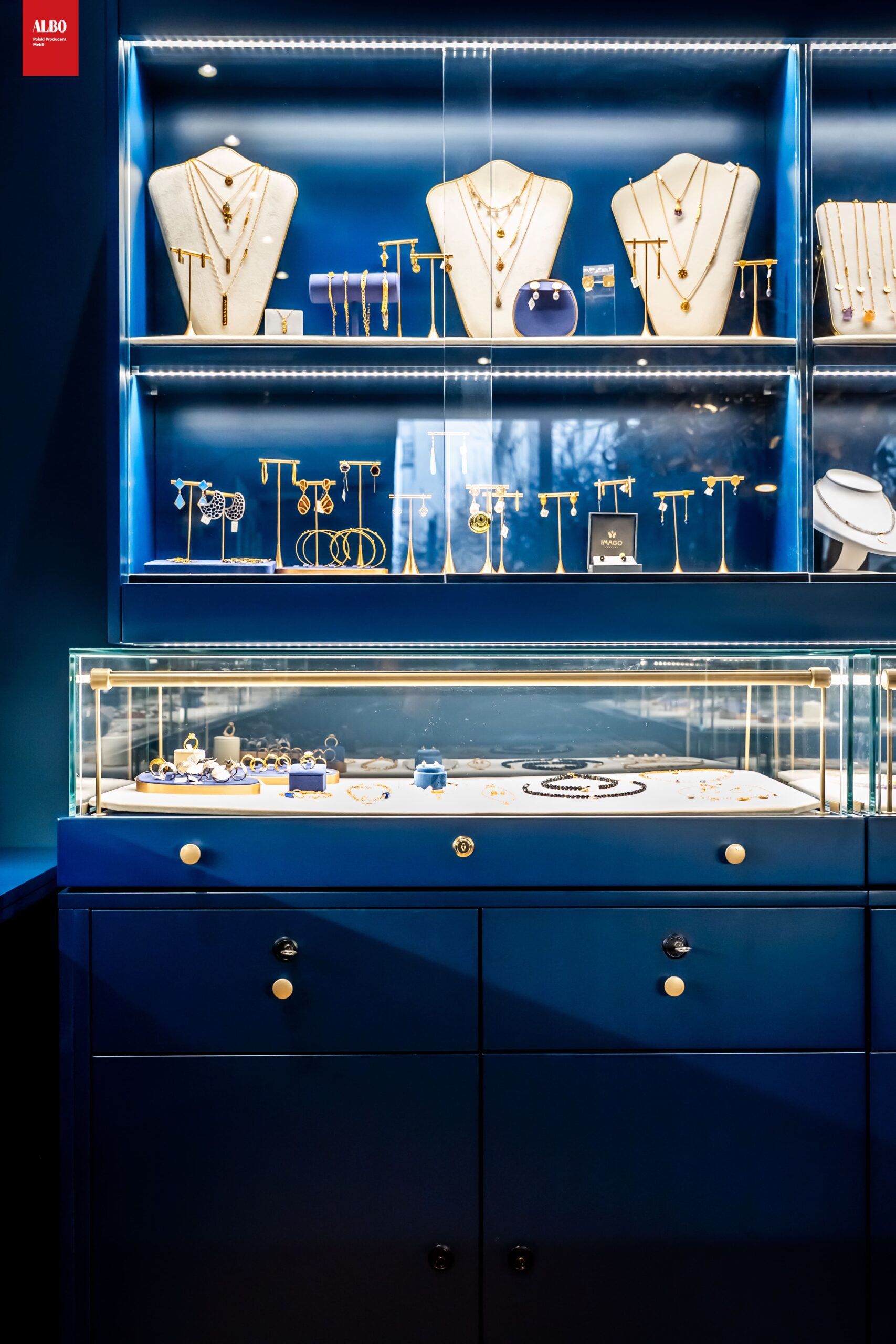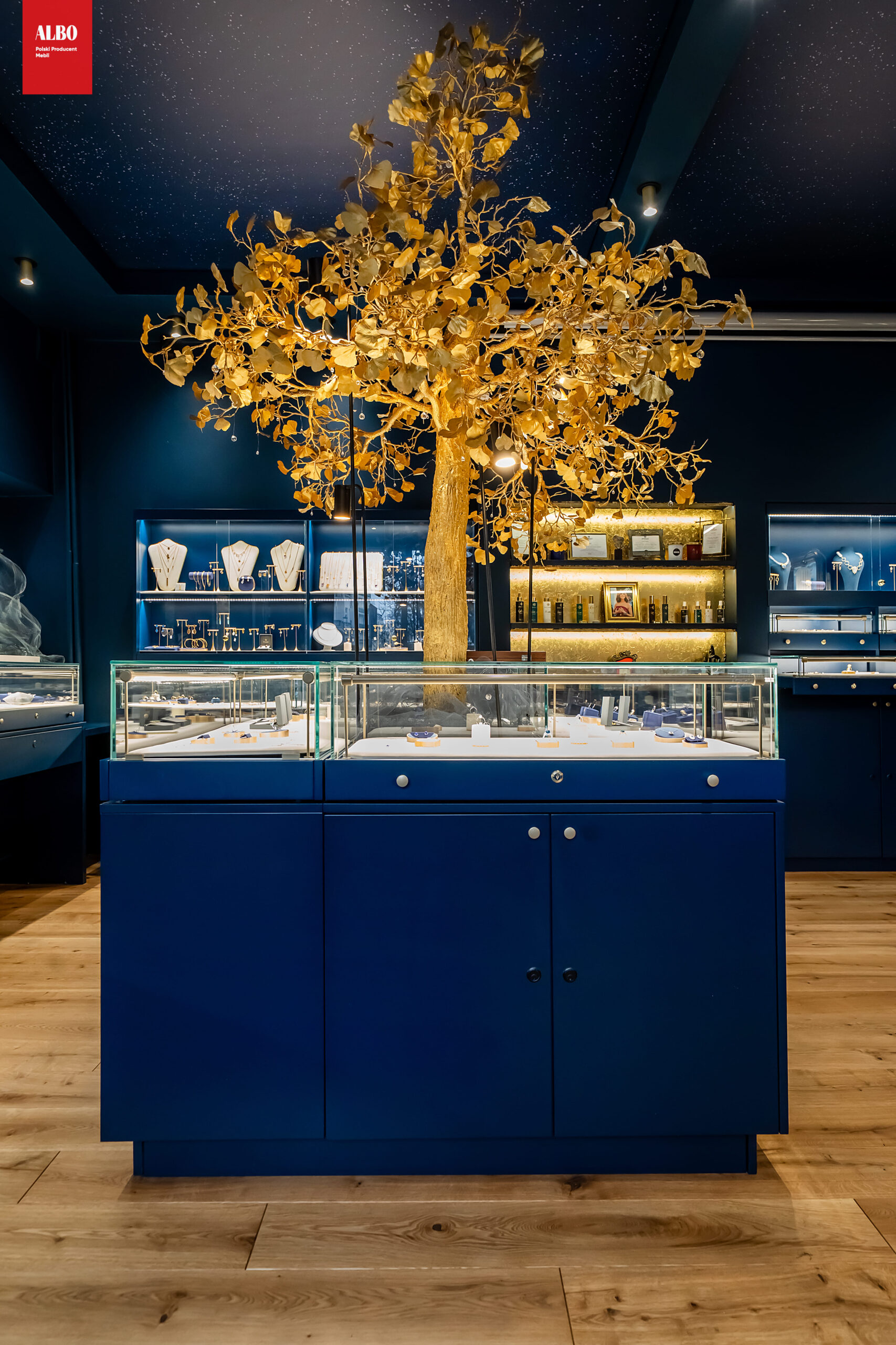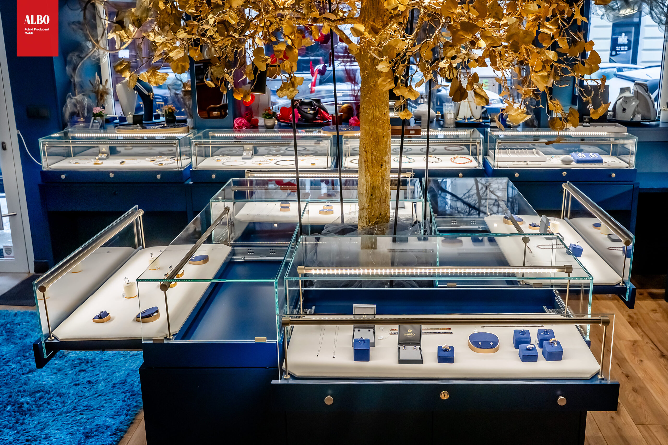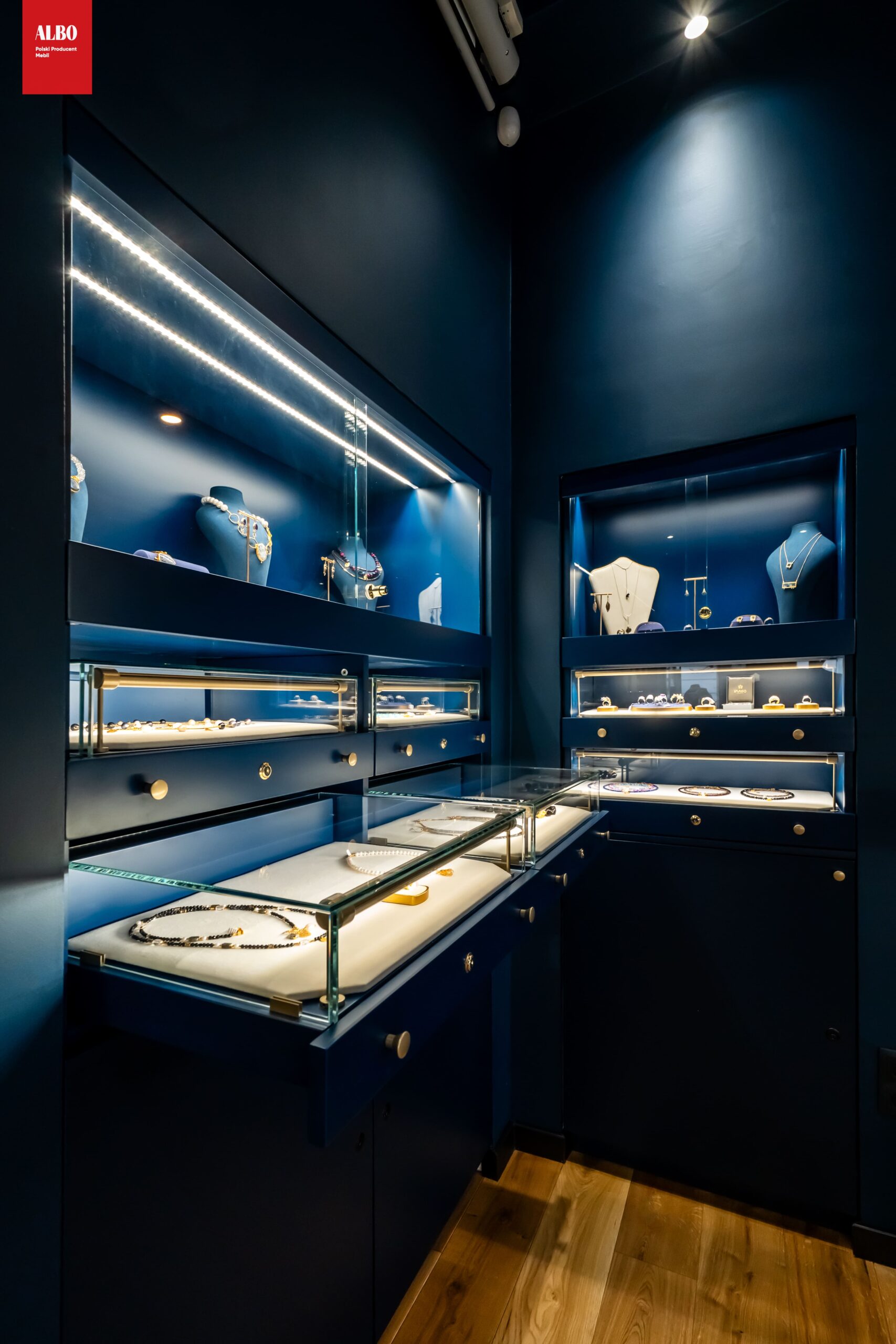 W tej realizacji wykonaliśmy witryny jubilerskie i gabloty szklane w kolorze indygo, co przyczyniło się do uzyskania wyjątkowego efektu. Szklane witryny zaprojektowaliśmy w oparciu o standardowe rozwiązania, jedocześnie dostosowaliśmy je do indywidualnych potrzeb klienta i pomieszczenia. Meble jubilerskie w monochromatycznym kolorze kobaltowym zostały zaprojektowane tak, aby nadać wnętrzu wyjątkowej klasy i nowoczesnego charakteru. W galerii jubilerskiej zostały wykorzystane witryny szklane z szufladami, które umożliwiają bezpieczną prezentację biżuterii klientom. Centralnym punktem została wyspa sklepowa z profesjonalnym oświetleniem LED, w której znajduje się przestrzeń magazynowa umożliwiająca przechowywanie opakowań prezentowych i zapasów. Witryny szklane i wyspa zostały oświetlone profesjonalnym oświetleniem HASTER, które zostało dobrane do potrzeb i oczekiwań klientów, dzięki czemu blask naturalnych kamieni jest idealnie podkreślony.
