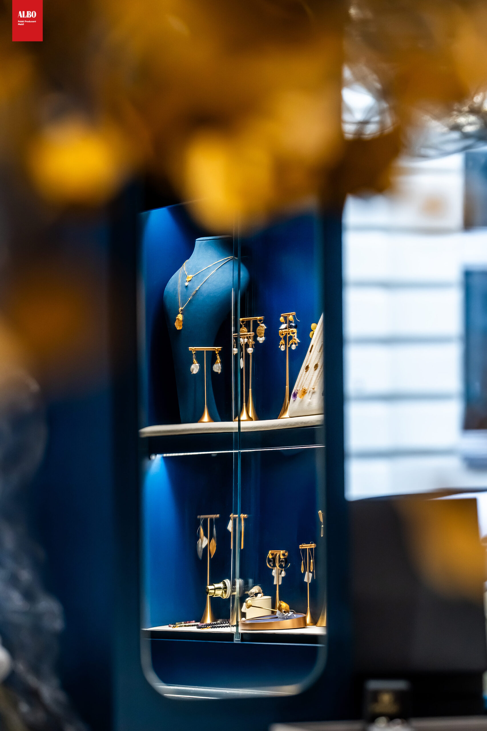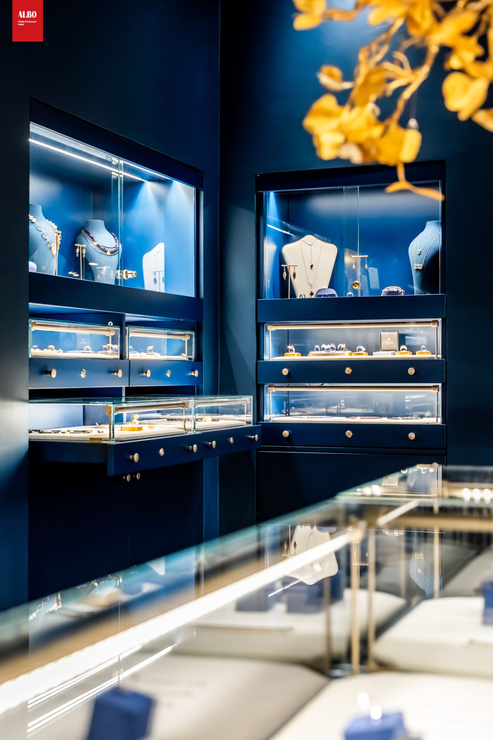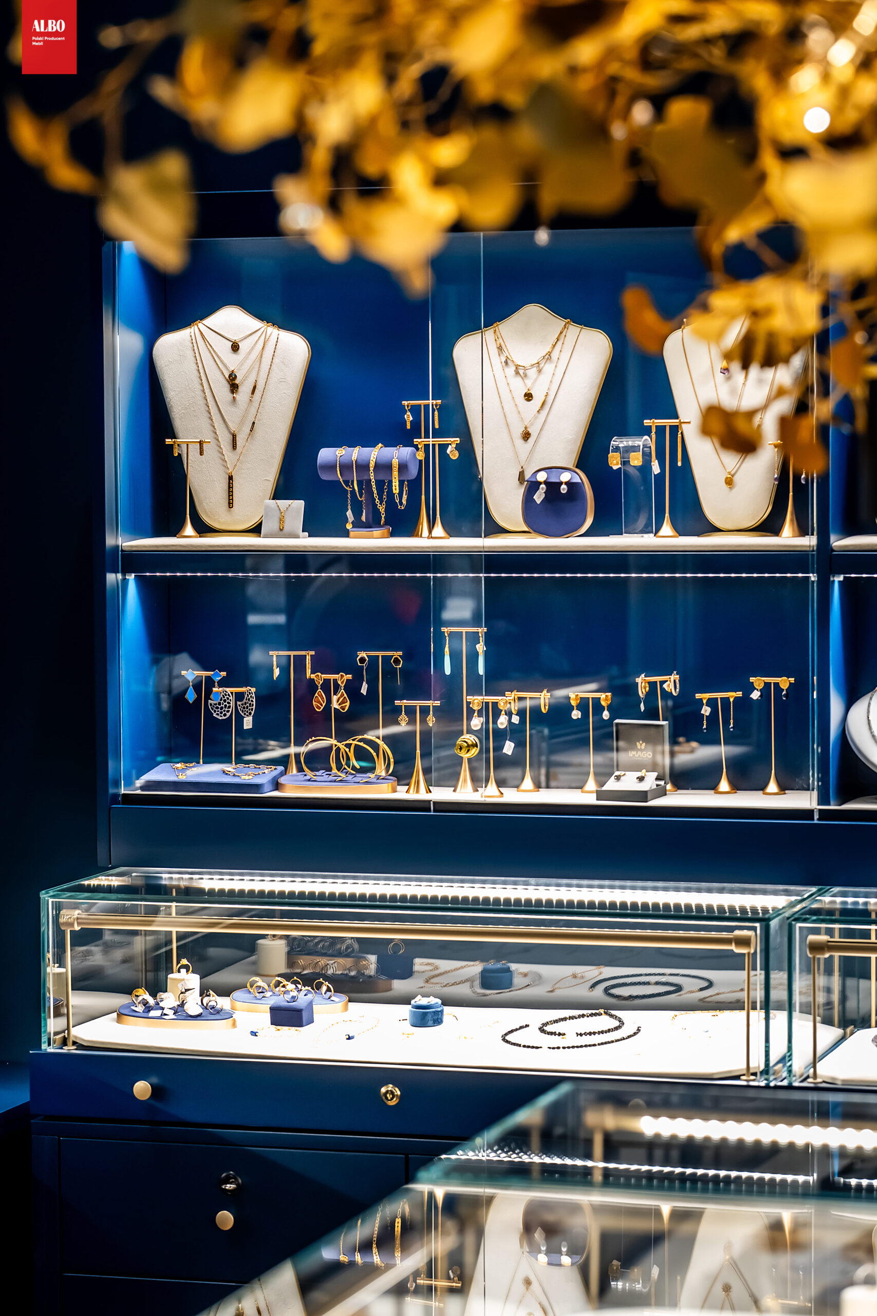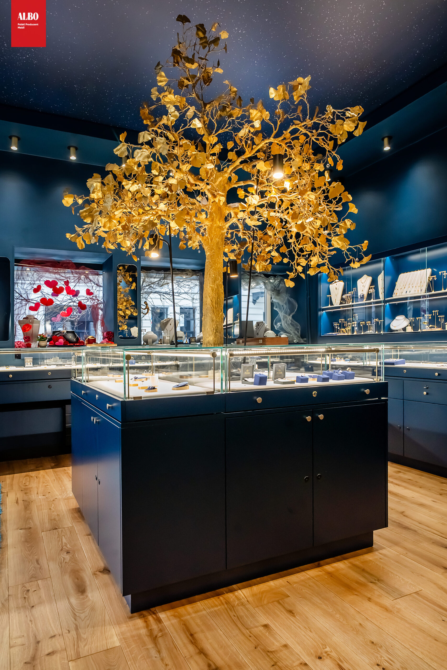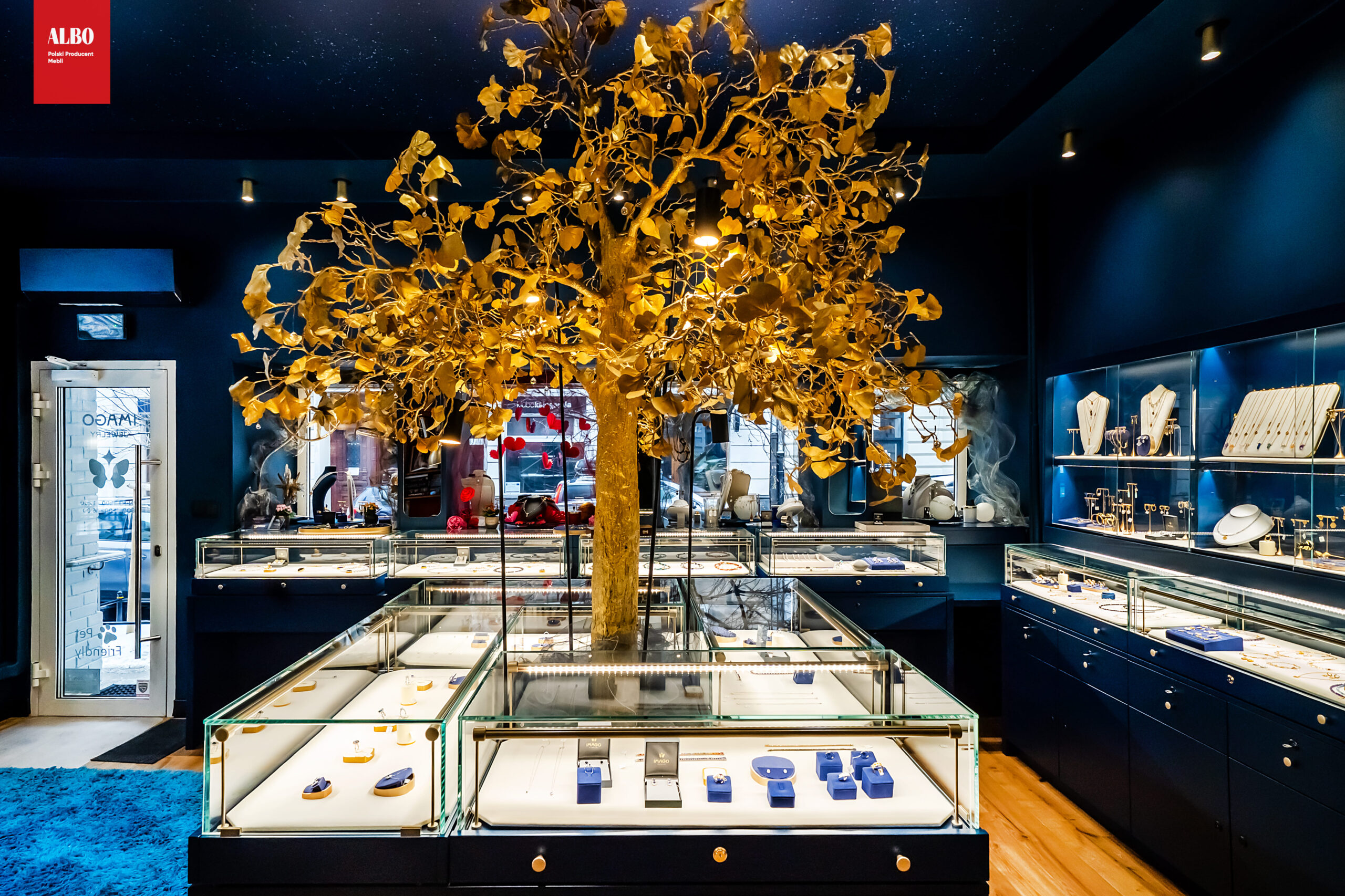 W tej realizacji wykonaliśmy witryny jubilerskie i gabloty szklane w kolorze indygo, co przyczyniło się do uzyskania wyjątkowego efektu. Szklane witryny zaprojektowaliśmy w oparciu o standardowe rozwiązania, jedocześnie dostosowaliśmy je do indywidualnych potrzeb klienta i pomieszczenia. Meble jubilerskie w monochromatycznym kolorze kobaltowym zostały zaprojektowane tak, aby nadać wnętrzu wyjątkowej klasy i nowoczesnego charakteru. W galerii jubilerskiej zostały wykorzystane witryny szklane z szufladami, które umożliwiają bezpieczną prezentację biżuterii klientom. Centralnym punktem została wyspa sklepowa z profesjonalnym oświetleniem LED, w której znajduje się przestrzeń magazynowa umożliwiająca przechowywanie opakowań prezentowych i zapasów. Witryny szklane i wyspa zostały oświetlone profesjonalnym oświetleniem HASTER, które zostało dobrane do potrzeb i oczekiwań klientów, dzięki czemu blask naturalnych kamieni jest idealnie podkreślony.