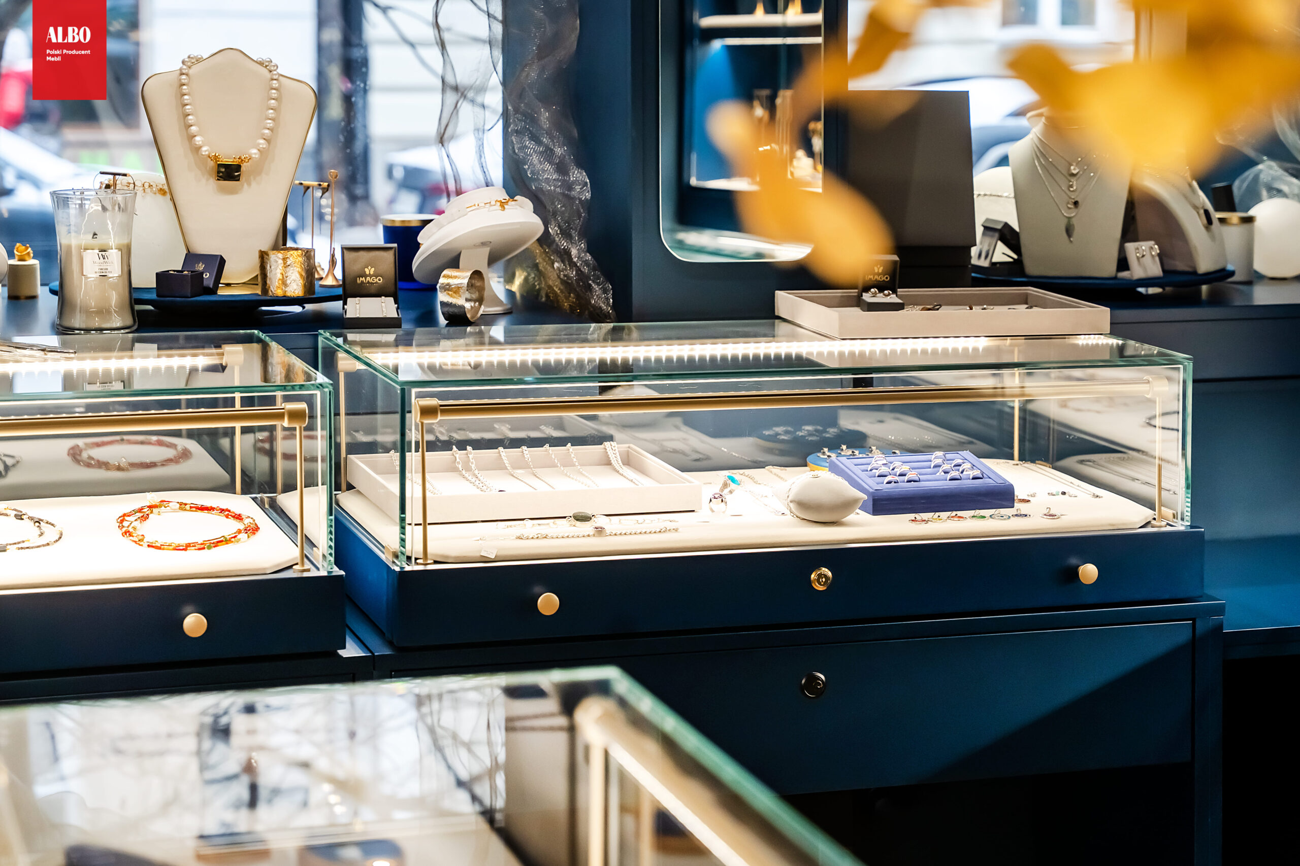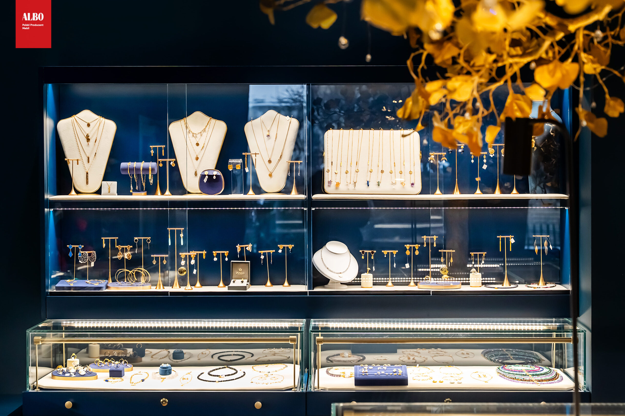 Kompozycja wnętrza została dopełniona specjalistycznym oświetleniem jubilerskim marki HASTER, które zostało indywidualnie dobrane do charakteru witryn szklanych oraz specyfiki salonu jubilerskiego. Dzięki takiemu rozwiązaniu ekspozycja zyskuje wyrazistość, a jednocześnie światło subtelnie akcentuje biżuterię, nie zaburzając spójności aranżacji. Zastosowane oświetlenie wspiera czytelność ekspozycji, w rezultacie oświetlone gabloty jubilerskie umożliwiają dokładniejsze postrzeganie form i detali. W szczególności wykończenia oraz struktura biżuterii stają się lepiej widoczne, dlatego uwaga klientów może zostać naturalnie skierowana na wybrane produkty. W rezultacie zwiększana jest atrakcyjność prezentacji, a także potencjał sprzedażowy całej przestrzeni.
